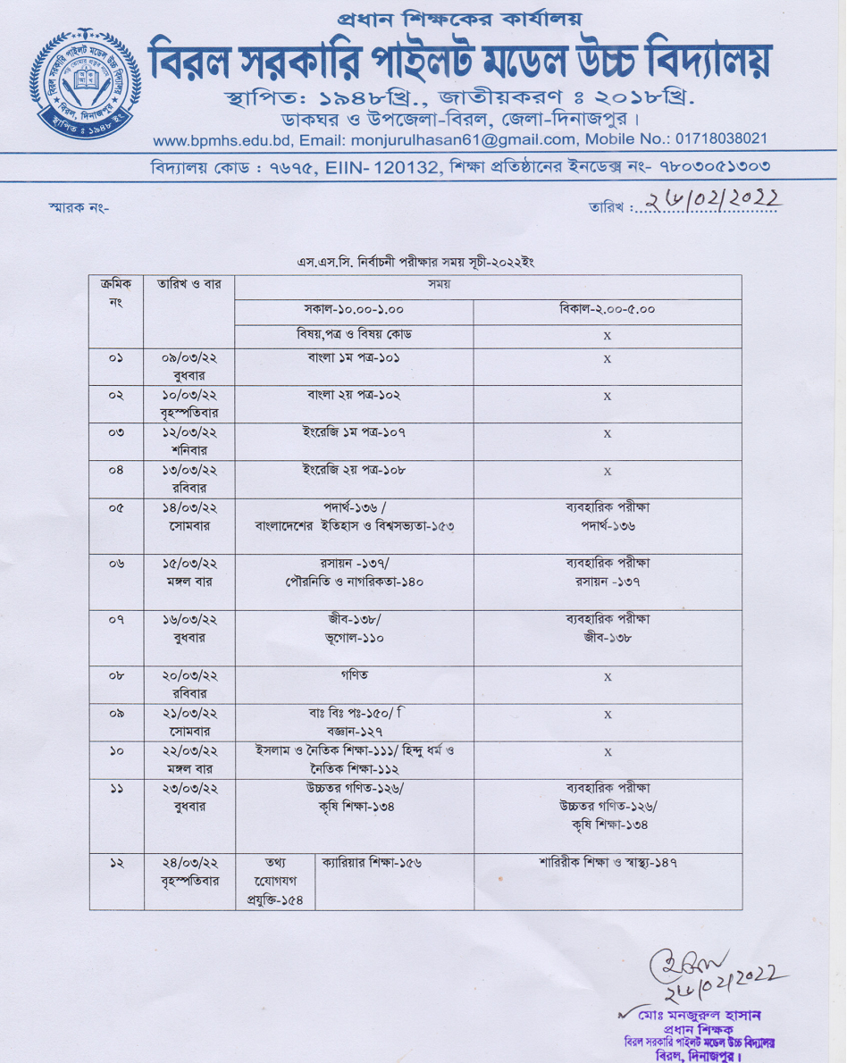 এস.এস. সি নির্বাচনী পরীক্ষার সময় সূচী -২০২২ ইং